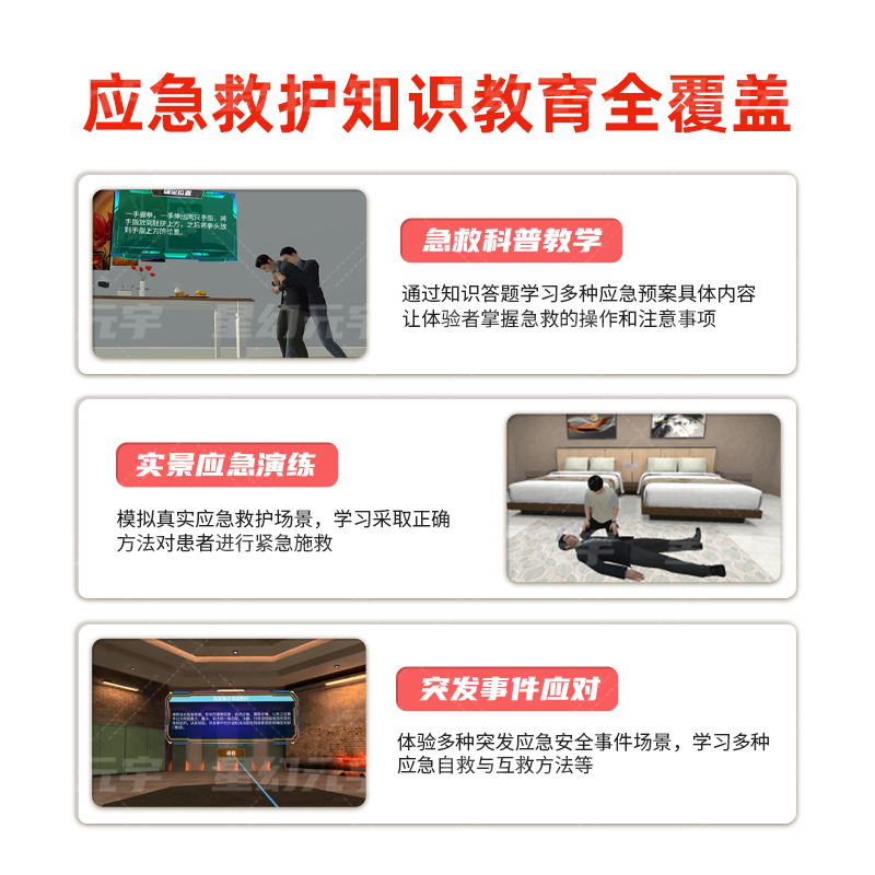 - 突发事件应对体验模块:涵盖防溺水、防触电、预防高空坠落等多种突发应急安全事件场景,学习者可沉浸式体验并系统学习应急自救与互救方法,确保应急救护知识无盲区、无死角。